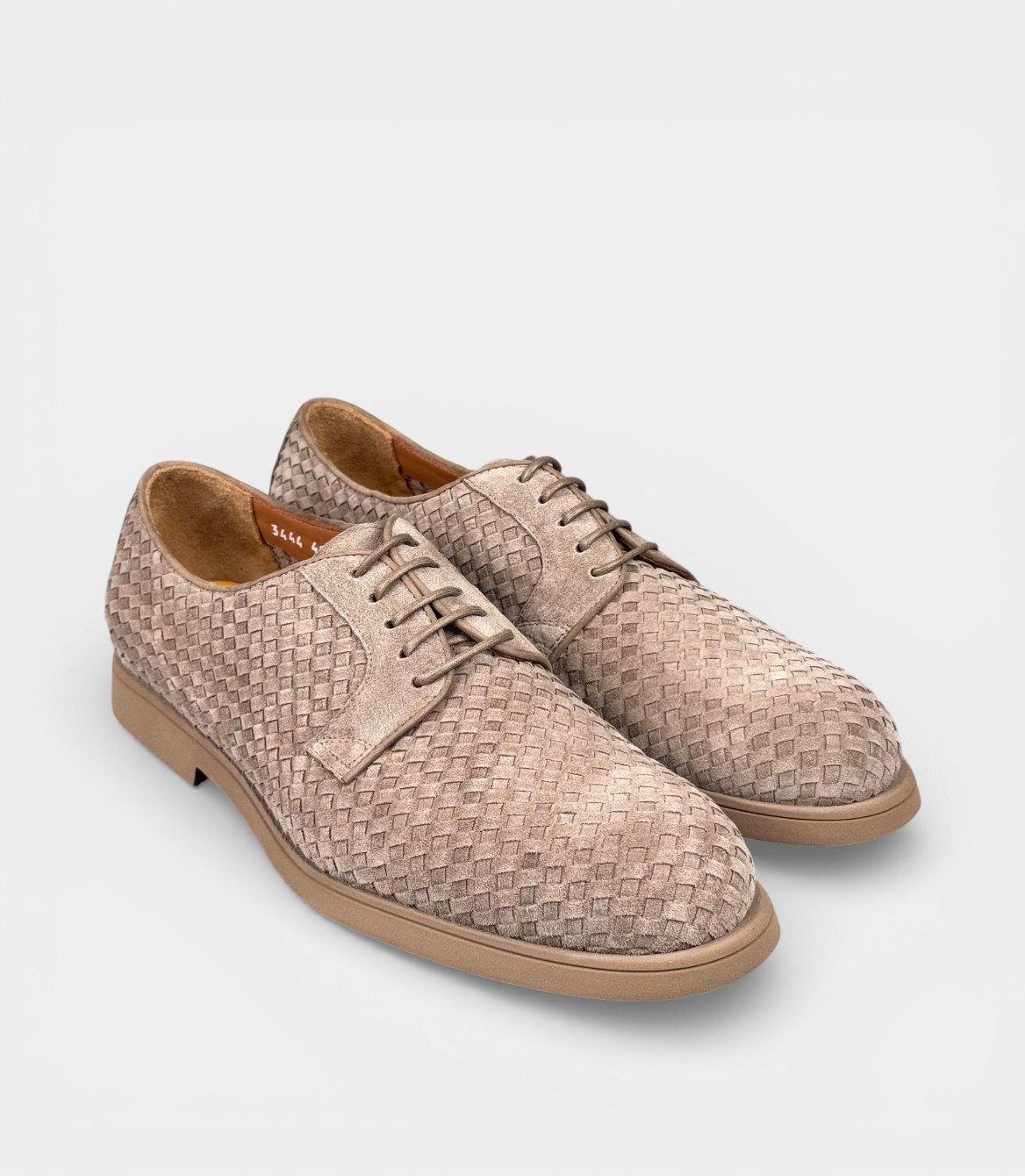 Якщо ви шукаєте чоловіче взуття, яке поєднує класику з сучасним дизайном, чоловічі замшеві туфлі Doucal's плетені бежеві стануть ідеальним вибором. Ця модель від відомого італійського бренду Doucal's вирізняється унікальним плетеним візерунком, який нагадує традиційне плетіння intrecciato, додаючи взуттю вишуканості та оригінальності. Бежевий колір робить туфлі універсальними для повсякденного та ділового гардеробу, а замшевий матеріал забезпечує м'якість і приємні відчуття під час носіння.