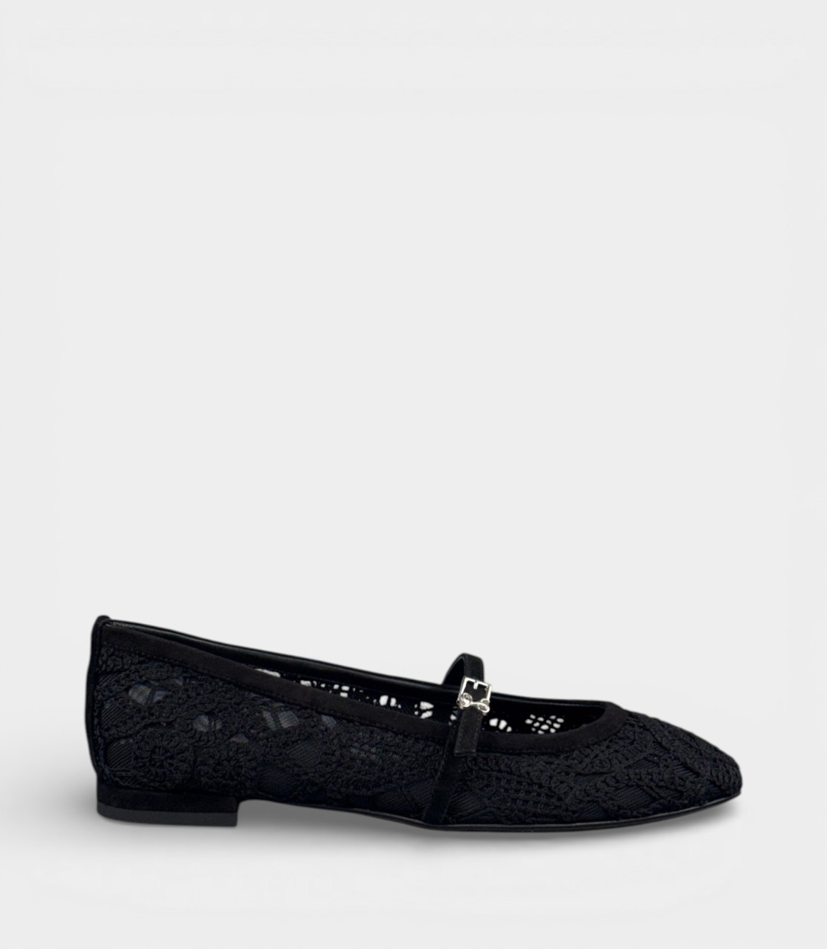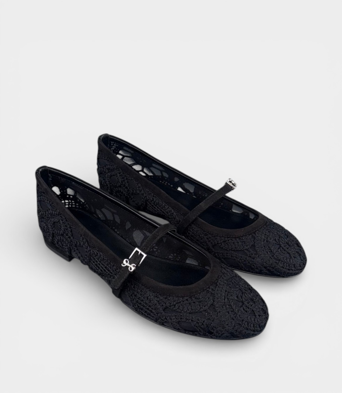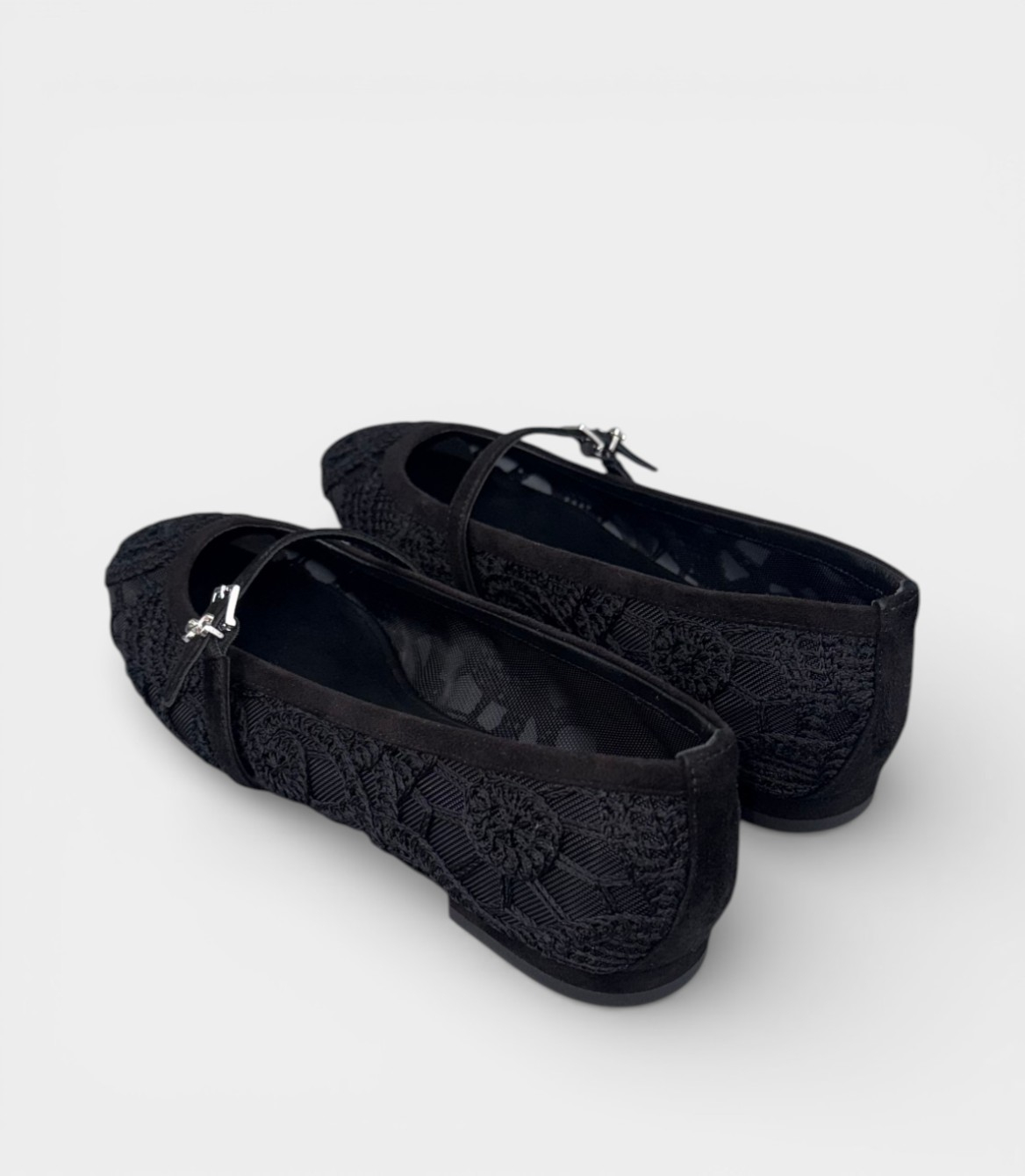 Верх цих балеток виконаний з вишуканого чорного мережива з ніжним квітковим візерунком, що створює ефект прозорості та легкості. Ремінець типу Mary Jane доповнений стильною металевою пряжкою сріблястого кольору – це додає моделі характеру та робить її впізнаваною. Підошва – тонка, але міцна, з легким підйомом, що забезпечує комфорт протягом цілого дня. Матеріали: мереживо на текстильній основі, замшевий ремінець та шкіряна підкладка для максимальної зручності.
