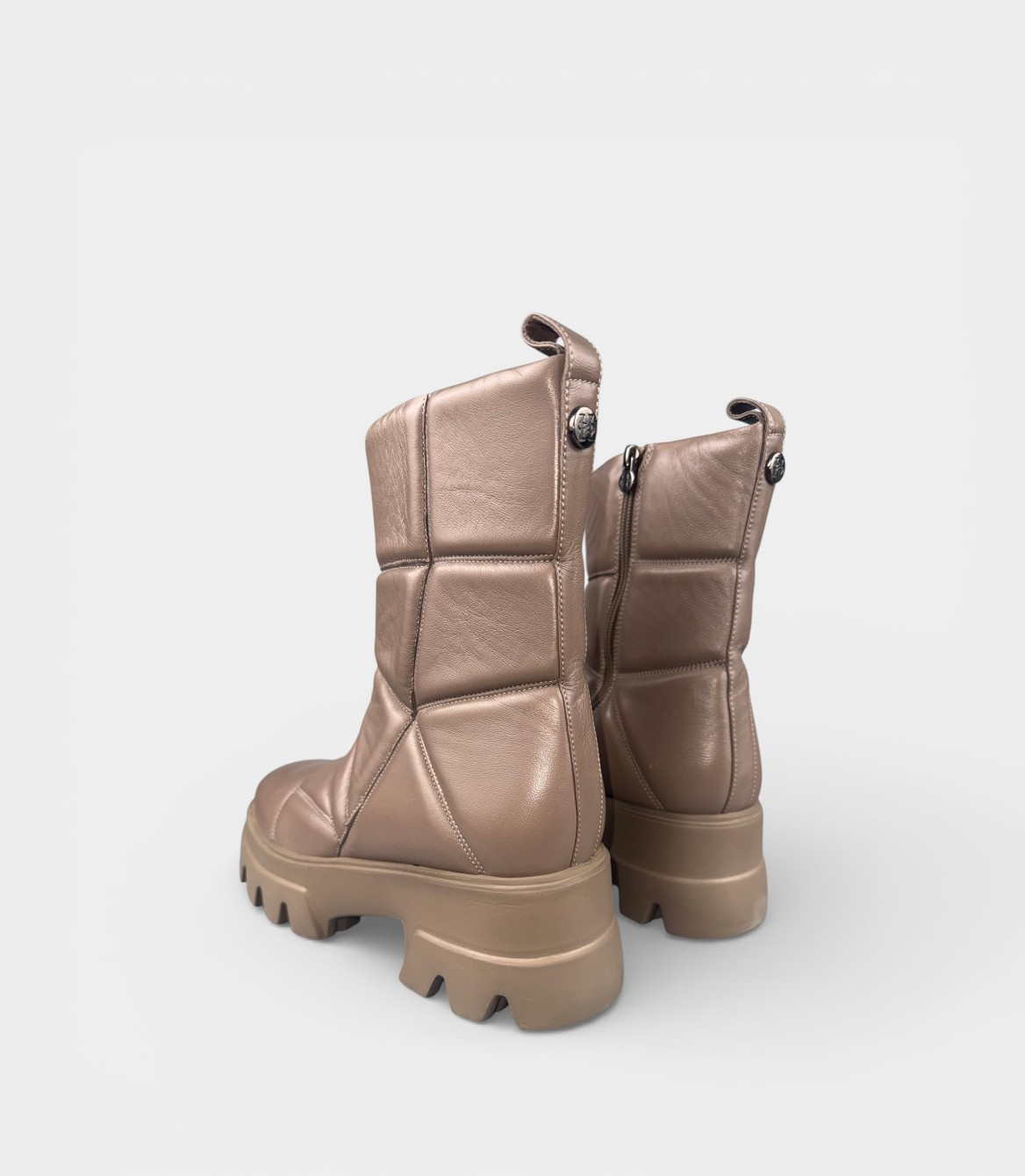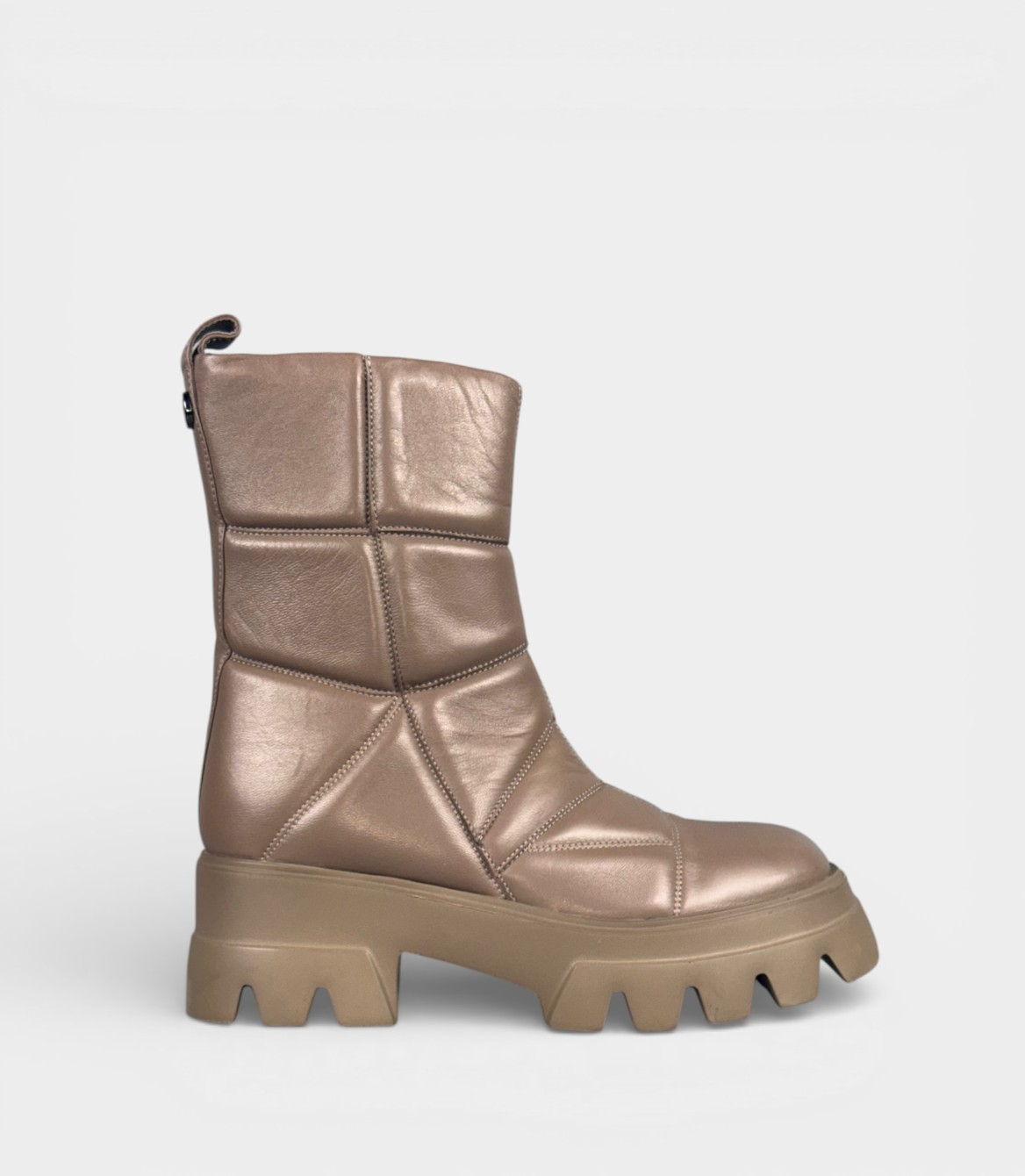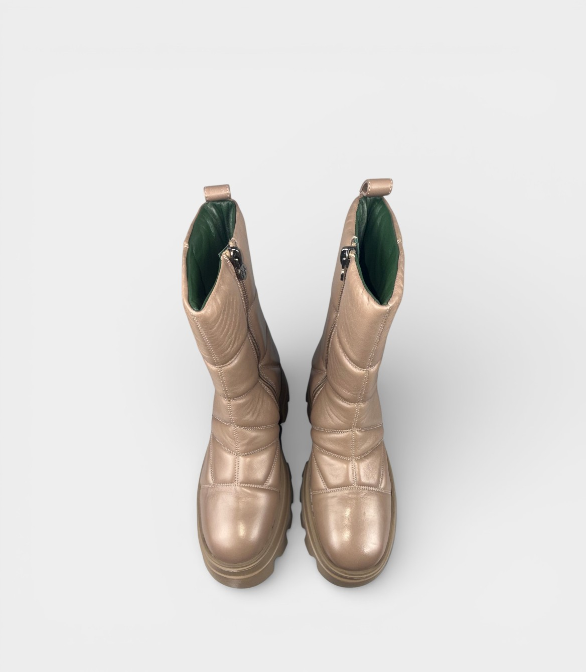 Бренд STOKTON з Італії відомий сміливими дизайнами та преміум-якістю Made in Italy. Ця модель – справжній хіт сезону: чоботи з стьоганою (quilted/puffer) натуральною шкірою в бежевому металік відтінку, масивною chunky платформою та ультрасучасним силуетом.
