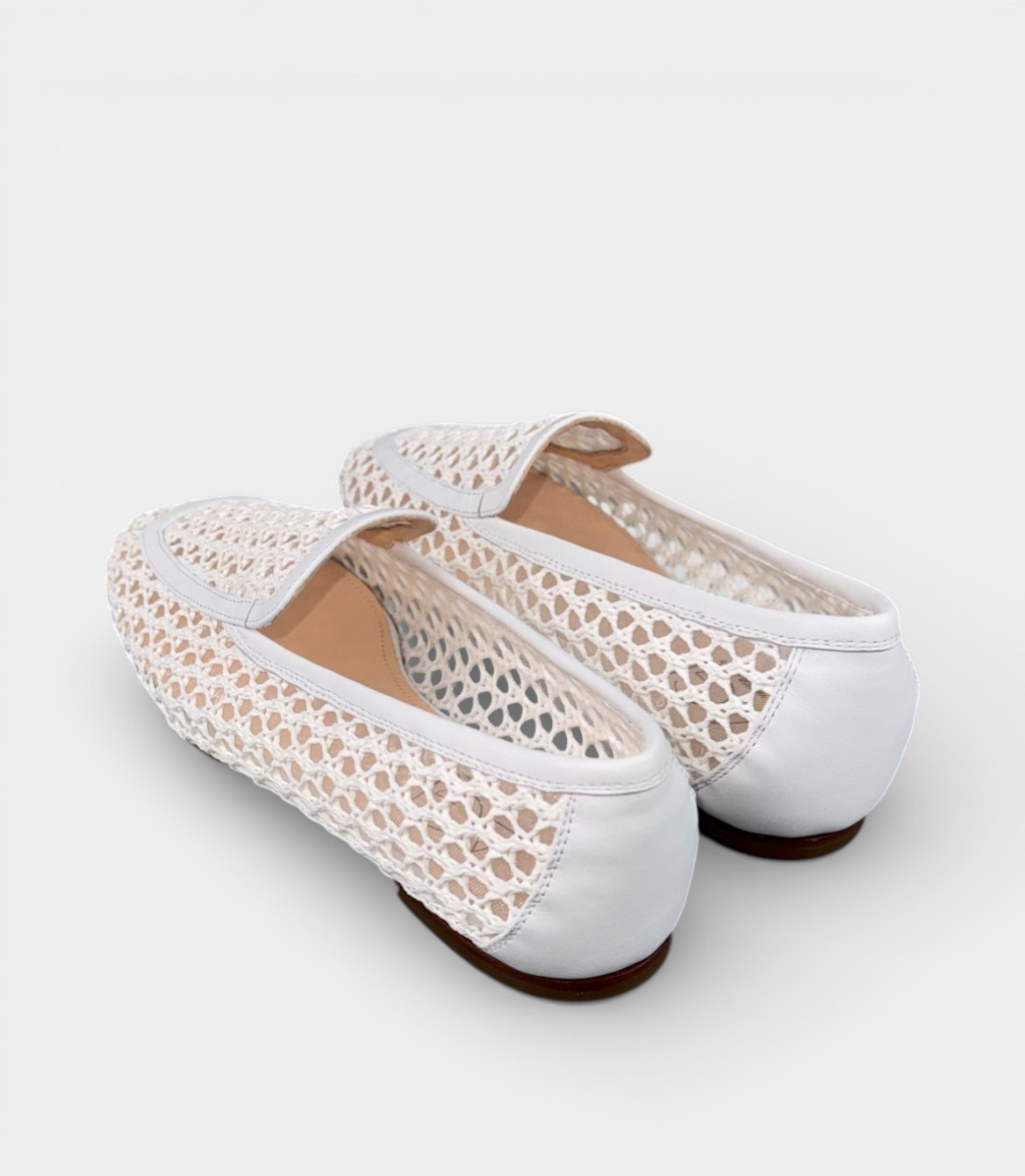 Верх цих лоферів виконаний з натуральної шкіри з відкритим сітчастим/плетеним візерунком (perforated mesh або crochet-style), що забезпечує відмінну вентиляцію та легкість. Білий колір з бежевою підкладкою додає свіжості та елегантності. Slip-on конструкція без шнурівки – легко взувати, м'яка окантовка по краю. Підошва – тонка, гнучка, з невеликим підйомом та коричневою шкіряною підметкою для зносостійкості. Бренд AGL відомий glove-like фітом – взуття ідеально облягає ногу.